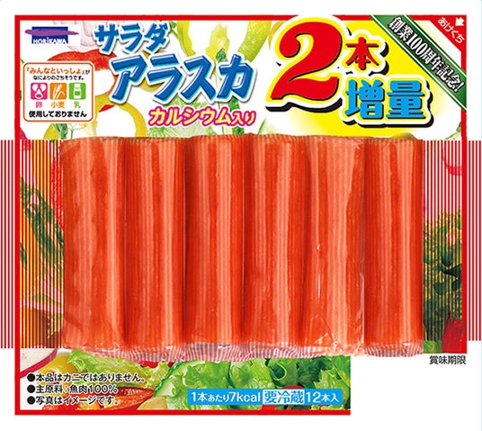 商品特徴:ベーシックなタイプのかに風味かまぼこです。サラダや巻き寿司、和え物など様々なお料理に。カルシウム入り。