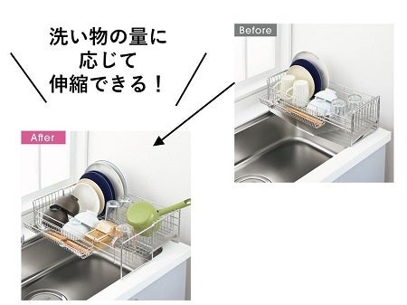 収納量に応じてサイズを変えられる便利な伸縮タイプ。洗い物の量が多い時、鍋やフライパンがある時には幅を伸ばしてスッキリ収納できます。