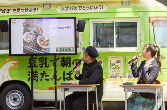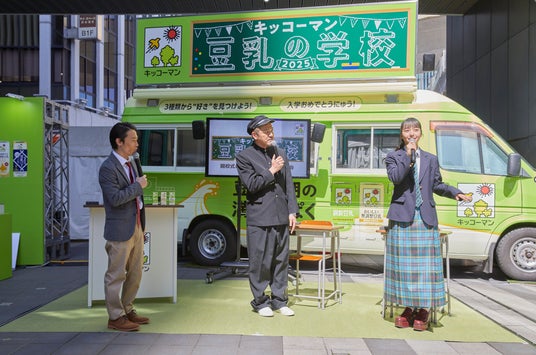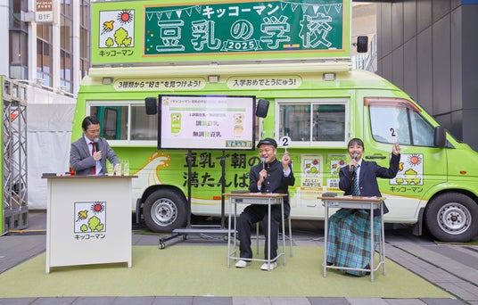 キッコーマンソイフーズ株式会社は、豆乳の魅力を楽しく学び、豆乳を身近に感じていただくための体験型イベント『キッコーマン 豆乳の学校2025』を東京(4月9日(水)~14日(月))と大阪(4月26日(土)、27日(日))の2会場で開催します。イベントに先立ち、4月9日(水)に、お笑いコンビ・カミナリさんと、タレント・山之内すずさんをゲストにお招きした『キッコーマン 豆乳の学校2025』開校式を行いました。