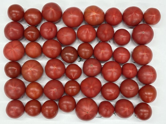 高級有機質たっぷりの土で栽培し、徹底した水分管理を行い、木で充分に完熟させてから収穫した当園オリジナルのこだわりトマトです。酸味が少ない品種なので、収獲してすぐに食べても酸味が気になりません。フルーツトマトは皮が固めな品種が多いですが、皮が薄い品種なので食べやすいです。