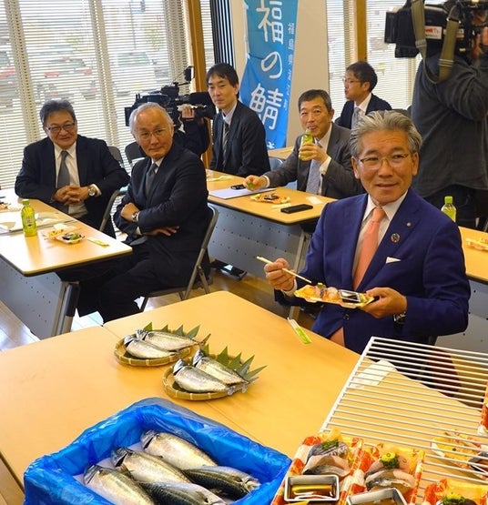 本日(4月10日)同町の「道の駅なみえ」で実施した出荷式には、日揮グループから日揮HD 代表取締役副社長執行役員 寺嶋 清隆、国内EPC事業会社である日揮株式会社 代表取締役社長執行役員の山口 康春、かもめミライ水産 大澤代表等が出席。大澤代表による事業内容の説明に続いて、浪江町 吉田 栄光町長、経済産業省 福島原子力事故処理調整統括官 新居 泰人様、復興庁 福島復興局長 志田 文毅様より来賓ご挨拶を頂き、また、公益社団法人 福島相双復興推進機構、公益財団法人 福島イノベーション・コースト構想推進機構、福島県相双地方振興局にも来賓として出席頂きました。出荷式の締めくくりに出席者全員で「福の鯖」を試食し、町の新たな特産品創出に期待する声が上がりました。