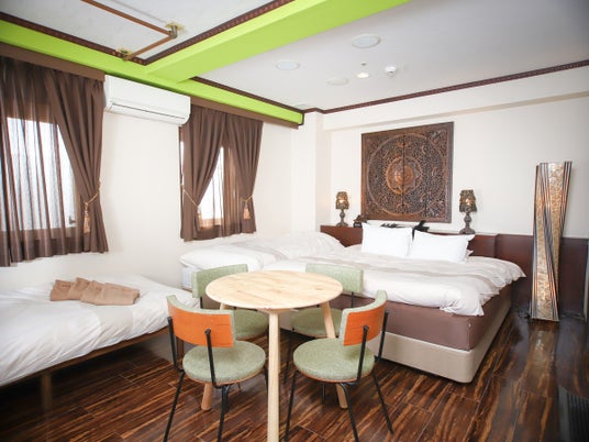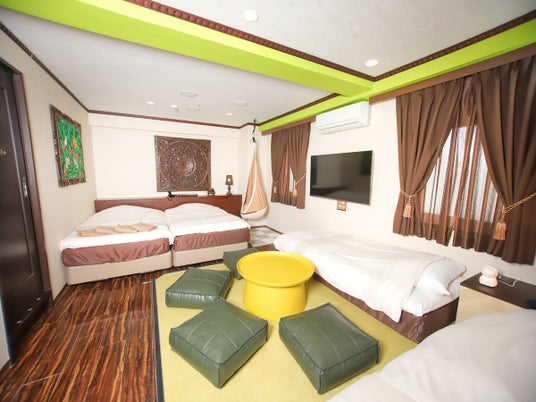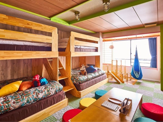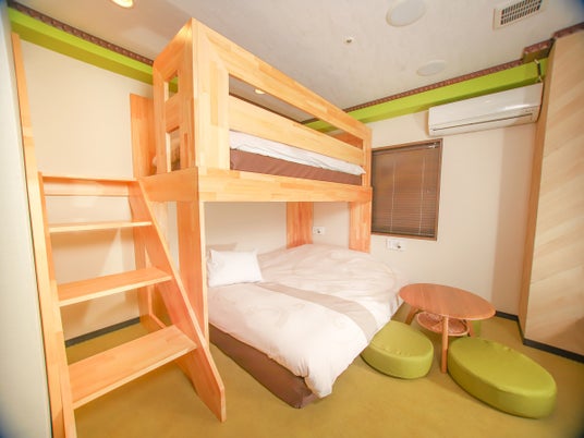 カジュアル3/クイーンベッド+ロフトベッド二段ベッドと、広々としたダブルベッドが魅力の温かみのある客室です。小さなお子様連れのご家族や、友人同士のご宿泊にぴったり。緑を基調としたデザインが心地よく、リラックスした時間をお過ごしいただけます。