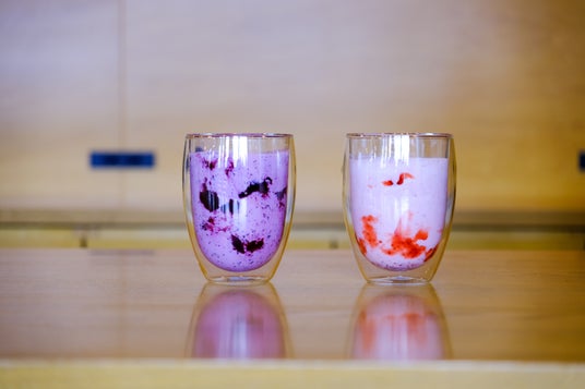 写真は、磐梯町産ブルーベリーと会津中央乳業の牛乳を使ったスムージー(左)、北会津産いちごと会津中央乳業の牛乳を使ったスムージー(右)。