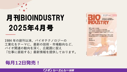 株式会社シーエムシー出版(本社:東京都千代田区、代表:金森洋平)は、雑誌『月刊BIOINDUSTRY 2025年4月号』を4月12日に発売します。紙媒体の「雑誌版」は税込6,050円(本体価格5,500円+税)で、当社ECサイト及び全国の書店でご注文を受け付けております。また同時に「電子版」も、電子書籍販売サイト「CMCeBook」にて税込5,500円(本体価格5,000円+税)で販売します。