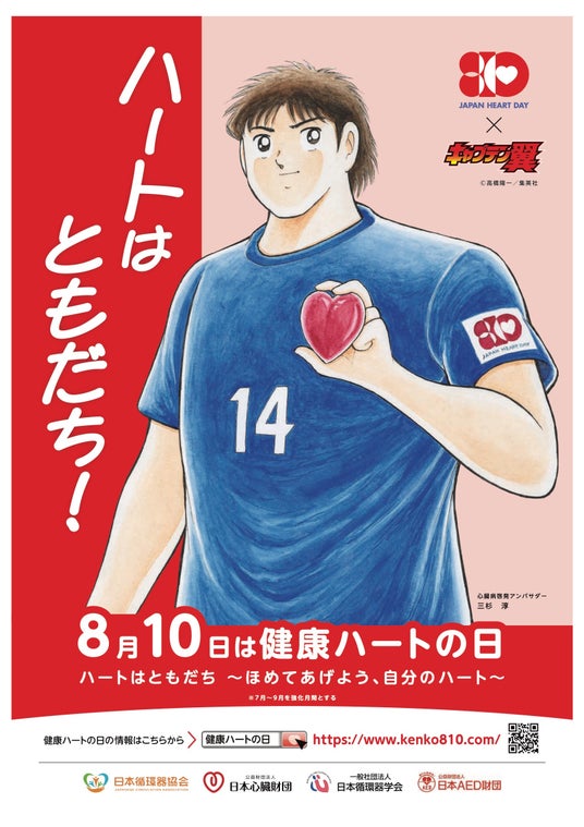 心臓の健康を考え、心身をいたわる「こころとからだの休日」を過ごすために、1985年に日本心臓財団が提唱した心臓病啓発デーが「8月10日は健康ハートの日」。一昨年からは、8月10日のみならず、複数日、複数週にまたがり数々の啓発イベントを展開しています。「ハートはともだち」を合い言葉に、心臓病を持つサッカー選手『キャプテン翼』三杉淳を心臓病啓発アンバサダーに迎え、日本中に心臓の大切さを伝えます。