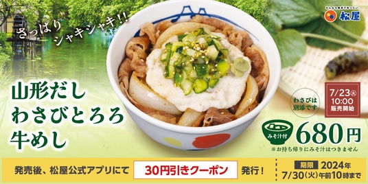 このたび松屋フーズ(本社:東京都武蔵野市、代表取締役社長:瓦葺一利)では、牛めし・カレー・定食・その他丼の「松屋」におきまして、2024年7月23日(火)10時より「山形だしわさびとろろ牛めし」を販売いたします。