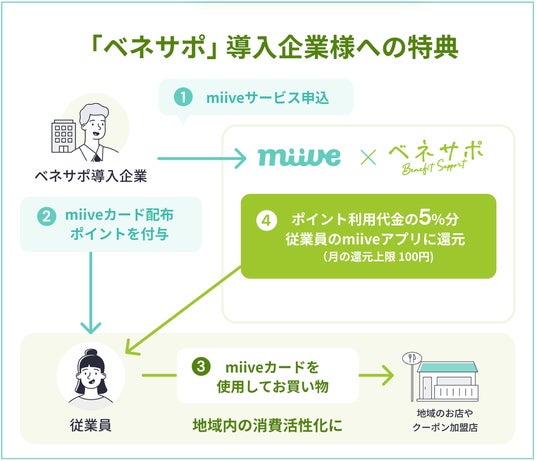 この取り組みは、地域企業の従業員の生活支援と地域経済の活性化を目的とし、「ベネサポ」導入企業がmiiveを併用導入した場合、miiveで運用する福利厚生利用額の5%相当を従業員に還元する内容となっています。ポイントはVISAカードが使える地域店舗で利用可能であり、従業員のQOL向上と地域消費の循環を生み出す新たな施策です。