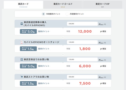 本サイトでは、3種類の新しい東武カード別に利用金額を入力することで簡単に、獲得できるポイントの目安を確認することができる、シミュレーションページを用意しています。