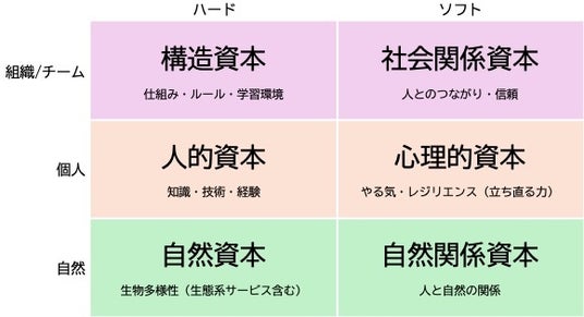 このフレームワークは、縦軸に関係するレイヤー(自然・個人・組織)、横軸に資本の性質(ハード=仕組み/ソフト=関係性)を設定し、ネイチャーポジティブ時代における学びの見取り図を提供します。