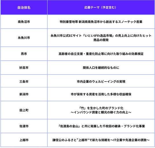 令和6年度は9市町村から9の課題をいただく予定です。順次チャレンジ新潟HPの「R6年度 参加自治体一覧とその課題」ページにて最新の情報を公開しています。