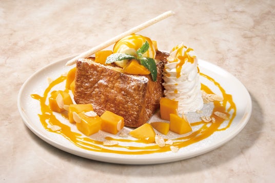 なめらかなバニラアイスとトッピングの生クリーム、マンゴーをふんだんに使用したフレンチトースト。マンゴーソースとの相性が絶妙な味わい♪