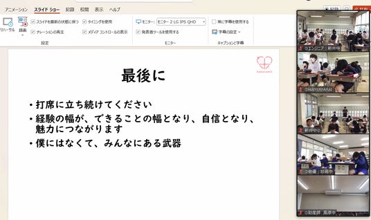 講演を聞かれていた先生からは、「生徒たちにとっては聞いたことがない話ばかりで、有意義な時間になったでしょう。生徒たちにはこれからたくさんの経験をしていってほしいと思います」とのコメントをいただきました。