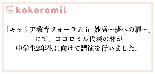 株式会社ココロミル(東京都新宿区、代表取締役社長:林大貴、以下「ココロミル」)は、2024年7月1日(月)に新潟県妙高市で開催された第8回「キャリア教育フォーラム in 妙高~夢への扉~」において、代表の林がアントレプレナーの経験を認められ、中学2年生向けに講師を務めたことをお知らせします。
