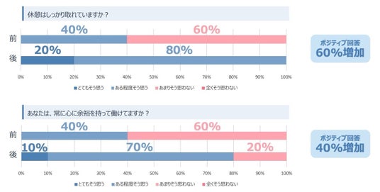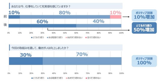 - 主体性が低く、率先した行動やコミュニケーションが少ない職員が元々多かったが、今回の取り組みを通して、普段意見を言わなかった職員が、業務改善のために積極的に発言するようになった