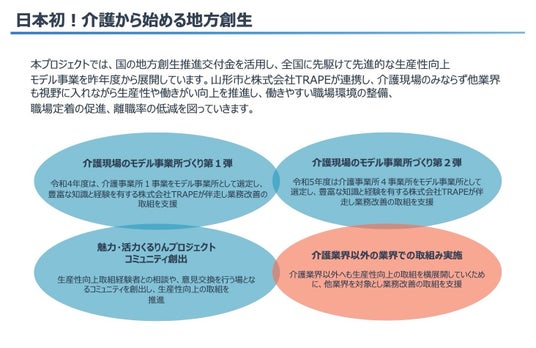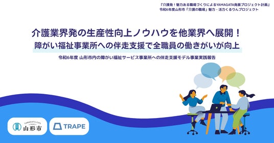 介護における生産性向上ガイドライン作成など、2017年から介護分野の生産性向上のためのさまざまな国の施策づくりで中心的な役割を担い、ウェルビーイングに溢れた介護事業所を創出するために「生産性向上」「働きがい向上」「リーダー育成」の3つを一度に実現することができる生産性向上伴走支援サービス「Sociwell(ソシウェル)」を展開している株式会社TRAPE(本社:大阪府大阪市、代表取締役社長:鎌田大啓)は、包括連携協定を結んでいる山形市と連携し、「介護の職場」魅力・活力くるりんプロジェクトの一環として、モデル事業所(障がい福祉サービス事業所)に対して伴走支援を実施し、成果を生み出すことができましたのでご報告させていただきます。