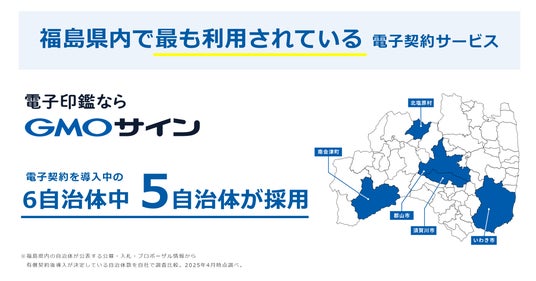 GMOグローバルサイン・ホールディングス株式会社(代表取締役社長:⻘山 満 以下、GMOグローバルサイン・HD)は、自社が開発・運営する電子契約サービス「電子印鑑GMOサイン」(以下、GMOサイン)が、福島県における電子契約を導入している自治体で採用率No.1(※1)を獲得したことをお知らせいたします。
