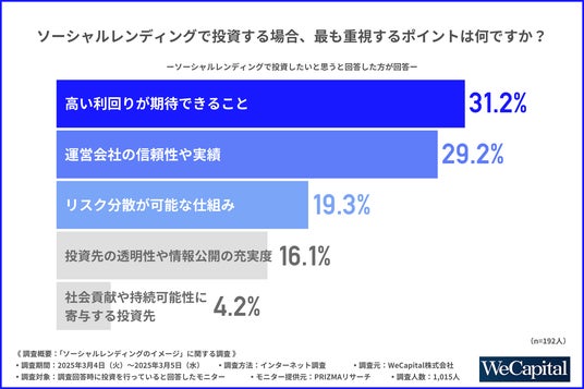 「ソーシャルレンディングで投資する場合、最も重視するポイントは何ですか?」と質問したところ、『高い利回りが期待できること(31.2%)』と回答した方が最も多く、次いで『運営会社の信頼性や実績(29.2%)』『リスク分散が可能な仕組み(19.3%)』となりました。