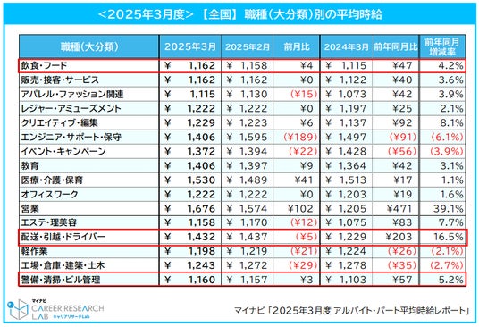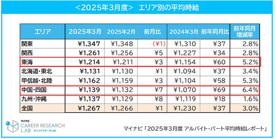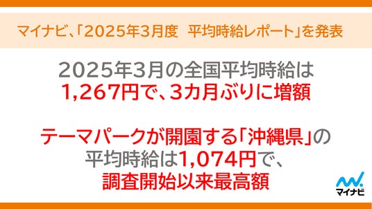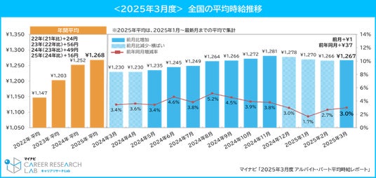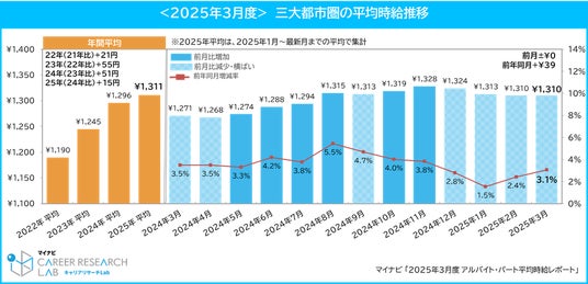 株式会社マイナビ(本社:東京都千代田区、代表取締役 社長執行役員:土屋芳明)は、アルバイト平均時給レポート(2025年3月度)を発表しました。本調査は、アルバイト・パート求人情報サイト『マイナビバイト』(https://baito.mynavi.jp/)に掲載された求人広告データを集計したものです。