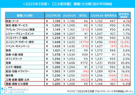 職種(大分類)別では、[飲食・フード]が1,199円(前月比4円増、前年同月比47円増)で調査開始以来最高額を更新し、1,200円台に迫る。[警備・清掃・ビル管理]は1,205円(前月比5円増、前年同月比61円増)で同じく最高額となる。