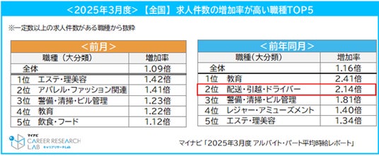 ◆2025年3月の全国平均時給は1,267円で、3カ月ぶりに増額。[配送・引越し・ドライバー]は1,432円。求人件数は前年同月比2.14倍と引き続き採用意欲が高い
