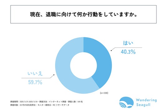 また、現在の職場を退職したいと感じることがある(「ときどきある」を含む)と回答された方に「現在、退職に向けて何か行動をしているか」を問う設問の回答では、「いいえ」が59.7%、「はい」が40.3%という結果になりました。この結果から、現在の職場を退職したいと感じることがある人の内、約4割が退職に向けて何らか行動をしていることが明らかになりました。
