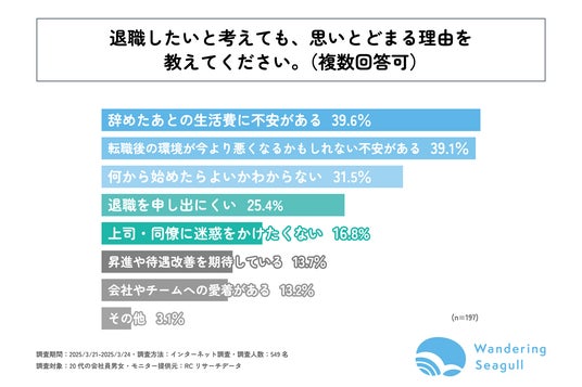 調査の最後、現在、退職に向けて行動をしていないと回答された方に「退職したいと考えても、思いとどまる理由」を尋ねる設問の回答で多かったのは、1位が「辞めたあとの生活費に不安がある」で39.6%、2位が「転職後の環境が今より悪くなるかもしれない不安がある」で39.1%、3位が「何から始めたらよいかわからない」で31.5%、4位が「退職を申し出にくい」で25.4%という結果になりました。この結果から、退職を思いとどまるのは経済的な問題や心理的な障壁が主な理由となっている人が多いことが判明しました。