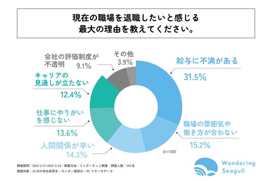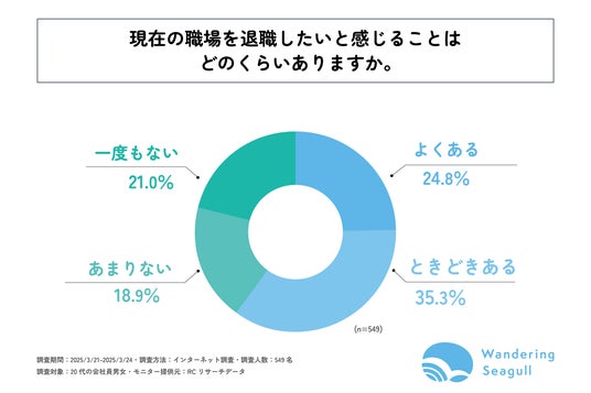 株式会社Wandering Seagull(本社:新潟県 新潟市、代表取締役:田村 広流)が提供する「退職代行だいじょうぶ」は20代の会社員を対象に「退職意向と行動に関する実態調査」を実施しました。この調査結果から、20代の若手ビジネスパーソンの退職意向と行動の実態等が明らかになりました。