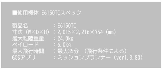 ・目視外飛行・夜間飛行(目視内)・人口集中地区(DID)上空の飛行・人または物件から30m未満の飛行。さらにE6150TCは従来必要だったカテゴリーIIの許可・承認申請が一部不要となります。