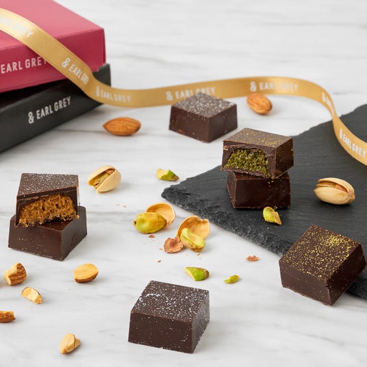 柔らかな甘みとコク、さらにほのかな苦みのバランスが絶妙のアーモンドとザクザクとザクザク食感を楽しめる、& EARL GREY オリジナルドバイチョコ。