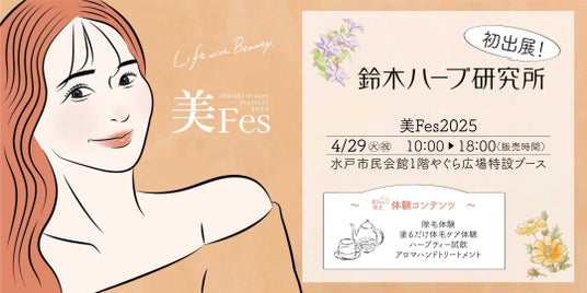 株式会社鈴木ハーブ研究所は、2025年4月29日(火・祝)に茨城県水戸市のMitoriOで開催される関東最大級の美容健康体験型イベント《美フェス2025》に初出展いたします。当日は、お子さまからご使用いただける「パイナップル豆乳除毛クリーム」の無料体験、新商品の「をりをりハーブティー」の無料試飲と先行販売、美フェス限定価格での人気商品販売など、美と癒しを五感で楽しめる内容をご用意いたします。