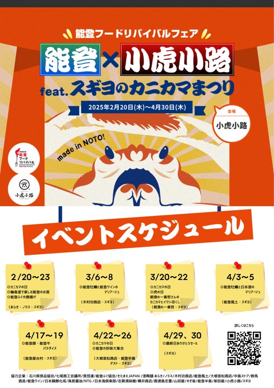 株式会社スギヨ、石川県食品協会、七尾商工会議所の共催で「能登フードリバイバルフェア」を東京・虎ノ門の居酒屋横丁「小虎小路」で開催しています。4月30日まで。小虎小路内の全10店舗がスギヨのカニカマやカキ、イワシ、ブリ、ナマコなど能登の食材を使用した料理を提供します。