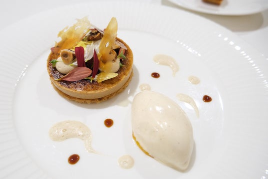 キャトルエピスのムースは、表面を炙りキャラメルの深い味わいとほろ苦さを感じる軽やかな口当たりに仕上げました。デコポンの爽やかな甘さでパン・デピスのスパイシーさを際立たせナツメグのグラス、マデラ酒香るコーヒーソース、ウィスキーの香り漂うキャラメルソースが絡み、プラリネのクリームが贅沢な味わいを引き立てる一皿です。