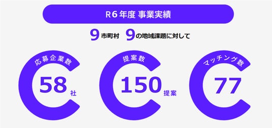 令和5年度から実施されている本プログラムでは、令和6年度は9市町村の9の課題に対して全国58社の企業から、150件の提案がありました。うち、77件がマッチングにつながり、市町村における事業化や連携協定の締結、実証実験の実施に至った企業があります。