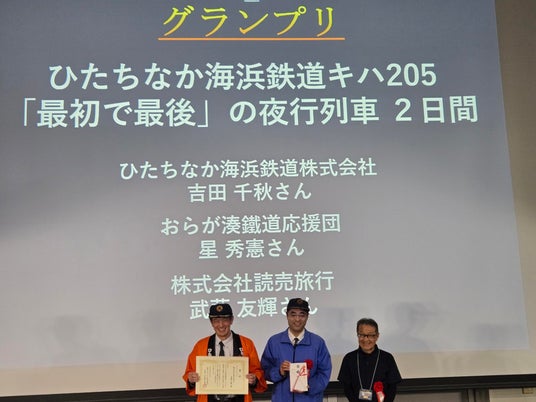 今回受賞したのは、「ひたちなか海浜鉄道株式会社×おらが湊鐡道応援団×株式会社読売旅行」です。ひたちなか海浜鉄道で長年活躍した人気車両「キハ205」の引退決定に伴い、ファンの方に喜んでいただけるイベントを実施し、送り出すことができればとの想いで、茨城県「いばらきアフターDC」実施期間にあわせ特別なツアーを実施しました。当社のグランプリ受賞は2018年「JR只見線全線復旧決定祈念」、2020年「鉄印帳」付きツアーに続き3度目となります。