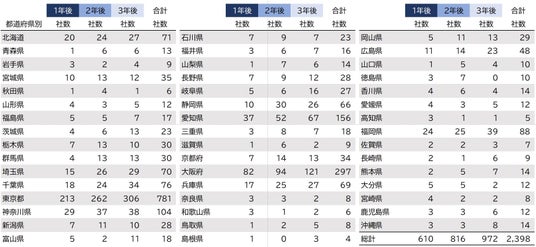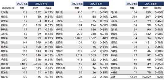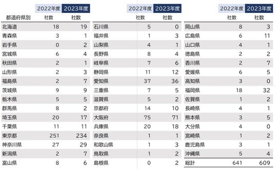都道府県別に見ると、最多は「東京都」の234社で、「大阪」71社、「愛知」36社と続く。2022年度と比べると総じて減少しているが、「福岡県」(18社→32社)、「広島県」(6社→11社)、「福島県」「香川県」(それぞれ2社→7社)の増加が目立った。