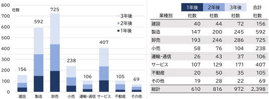 2023年度時点で100億企業ではないが、同期以前3期の年商伸び率(平均)から、2024年度以降3期以内に100億企業となる可能性がある企業「ネクスト100億」を抽出すると、国内企業のうち2,398社が該当していることが分かった。1年後(2024年度)は610社、2年後(2025年度)は816社、3年後(2026年度)は972社が新たに100億企業となる可能性を秘めている。業種別で最も多いのは「卸売業」の725社(1年後193社、2年後246社、3年後286社)。次いで「製造業」の592社、「サービス業」の407社となっている。