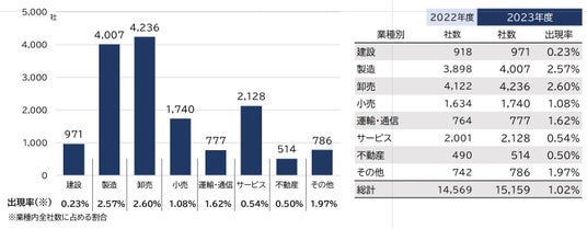 業種別に見ると、伊藤忠商事など「卸売業」が4,236社と最も多く、次いでトヨタ自動車など「製造業」が4,007社などとなっている。また、業種内の全企業に占める割合(※出現率)でみると、同じく「卸売業」の2.60%が最も高く、次いで「製造業」の2.57%となっている。
