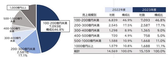 2023年度決算(2023年4月期~2024年3月期、単体)時点で「100億企業」(年商100億円以上の企業)は、全国に1万5,159社あることが判明した。これは国内企業約149万社の1%にあたり、出現率は企業の100社に1社に相当する。前年度(1万4,569社)と比べ590社増加した。