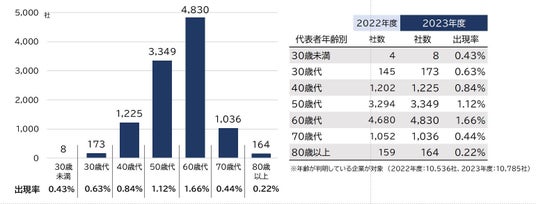 代表者年齢別に見ると、「60歳代」が最も多く4,830社(出現率1.66%)。数は少ないながら、「30歳代」は173社(同0.63%)、「30歳未満」は8社(同0.43%)あることが判明した。