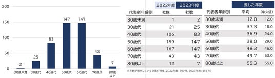 代表者年齢別に見ると、「50歳代」と「60歳代」がいずれも147社で最多となった。100億企業全体と比べると50歳代以下の構成比が高い。