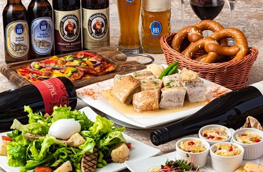 【DINNER】ディナータイムにおすすめなのが夏季限定でお楽しみいただける「ゾマーコース」。自家製白ソーセージや夏の旬菜とチョリソーのドイツ風ピザが楽しめるほか、ドイツビール2種を含む飲み放題が付いているのも嬉しいポイント。暑い夏に是非ともお楽しみください。