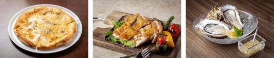(左)銀座バール・デルソーレ2Due「ピッツァ クアトロ フォルマッジ」(中央)シュタインハウス銀座「大山鶏のソテー ハチミツマスタードソース」(右)Oysterbar&Wine BELON 銀座店「ハチミツレモン・ヴィネガー」