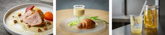 (左)ahill「山形県産 金華豚のロティ 銀座はちみつとロックフォールチーズのソース」(中央)BISTRO J_O「冷製コーンスープ 楽塩のスノースタイル&銀座はちみつの塩バターロール」(右)J_O CAFE「銀座はちみつ LEMON SQUASH ~2024~」