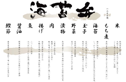 『日本が誇る弁当文化「海苔弁」。その海苔弁を世界に発信するべく日本全国の本物の食材を集め、ひとつひとつが全て主役になるように。そして全てが絡み合うように丁寧に仕上げたひとつの海苔弁。手に取ればずっしりと、ふたを開ければ期待が膨らむ豊かな風景。箸をすすめる度におどろきと笑顔が溢れる海苔弁。元気の源、食の欲。海苔弁で日本を元気に。食の欲で日本を元気に。』をコンセプトに掲げ、2020年7月オープンの1号店「海苔弁いちのや 靖国通り本店」を皮切りに、2024年7月現在計32店舗を展開しております。海苔弁いちのや 靖国通り本店の広さは8坪。毎年年商9,000万円を超える売上を誇っております。
