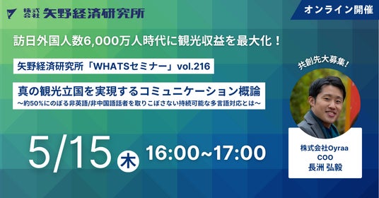 150言語2,700名の通訳者からのサポートを必要なときに予約不要で1分から利用できる通訳アプリ『Oyraa』を提供する株式会社Oyraa(本社:東京都港区、代表取締役社長:コチュ・オヤ、以下:当社)は、当社COOの長洲 弘毅が矢野経済研究所主催のセミナーに登壇し『真の観光立国を実現するコミュニケーション概論』について講演することをお知らせいたします。