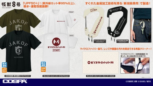 アニメ『怪獣8号』より、「モンスタースイーパー」「日本防衛隊 第3部隊」ドライTシャツ、カラビナなど、「怪獣8号」の世界観を楽しめるグッズがCOSPA(コスパ)から登場。