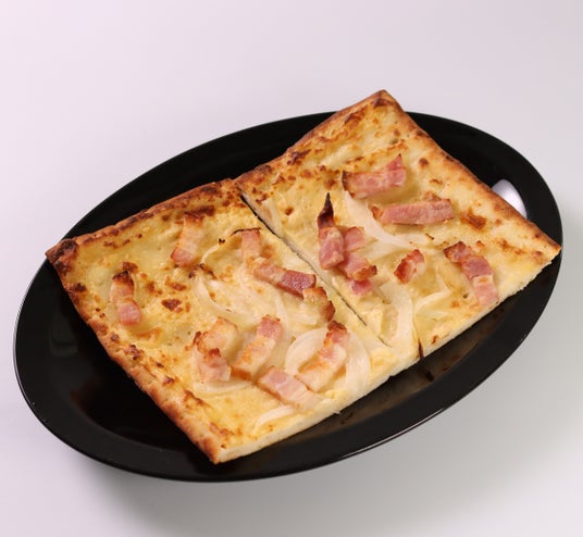 タルトフランベ(販売期間:5/2~5/6まで)フランス・アルザス地方の郷土料理で、レストランやカフェでよく食べられるメニューです。薄いピザ生地にチーズソース・ベーコン・玉葱をトッピング超高温で焼き上げたフランス風のピザです。