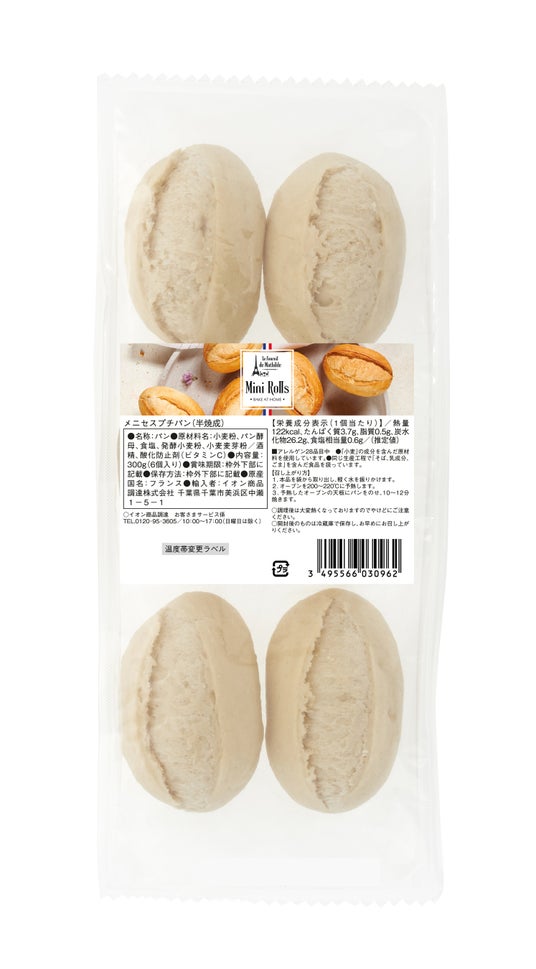 Menissez プチパン 50g×6個入≪イオン初登場≫“焼き立てのパンをご自宅で”をコンセプトに半焼成のパンを展開する「メニセス」のプチパンです。ご家庭で軽く焼いて仕上げていただくことで、表面はカリッと、中身はふんわりとした本格的なフランスパンをお楽しみいただけます。小さめのサイズで、朝食や昼食だけでなくおやつにもおすすめです。
