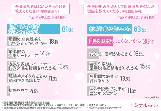 今回の調査結果で、全身脱毛をはじめたきっかけや医療脱毛を選んだ理由などが明らかになりました。