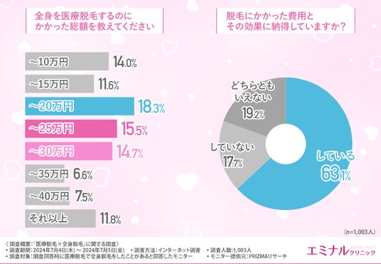 全身を医療脱毛するにはある程度の費用がかかるようですが、かかった費用と効果に納得している方はどのくらいいるのでしょうか。